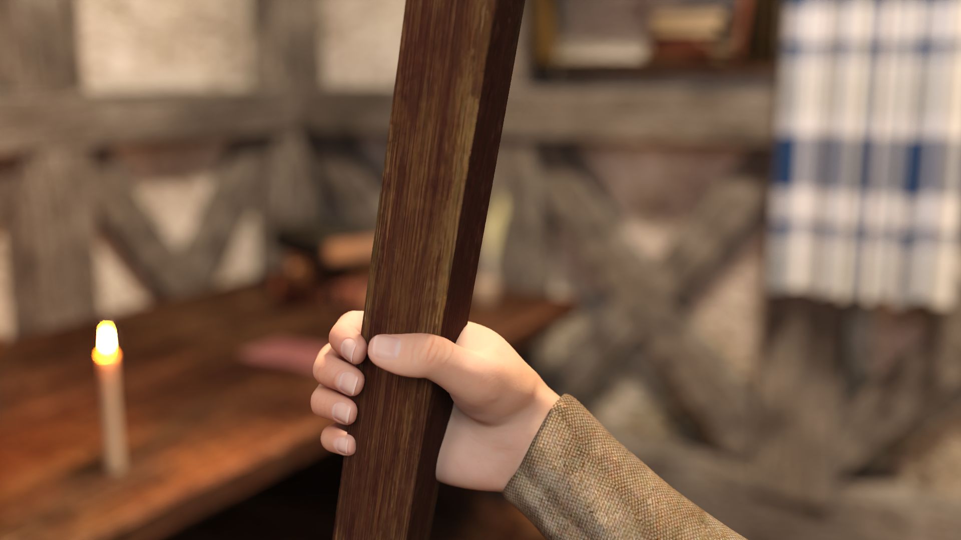 "You: Great, using the candelabra, I can break one leg off the chair!"